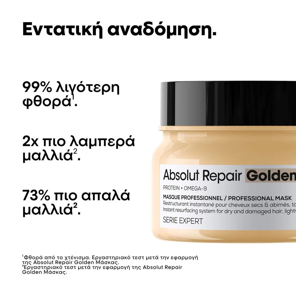 Εμπλουτισμένη με GOLD QUInoA + ΠΡΩΤΕΪΝΗ, η επαγγελματική σύνθεση της Serie Expert Absolut Repair Μάσκας προσφέρει εντατική περιποίηση και άμεση αναδόμηση στα ταλαιπωρημένα μαλλιά. Η κρεμώδης υφή της θρέφει την τρίχα, προσφέροντας στα μαλλιά ανάλαφρη αίσθηση, αφήνοντας τα μαλλιά 7x πιο λαμπερά* και πιο λεία, για μεγαλύτερο έλεγχο στο φορμάρισμα.